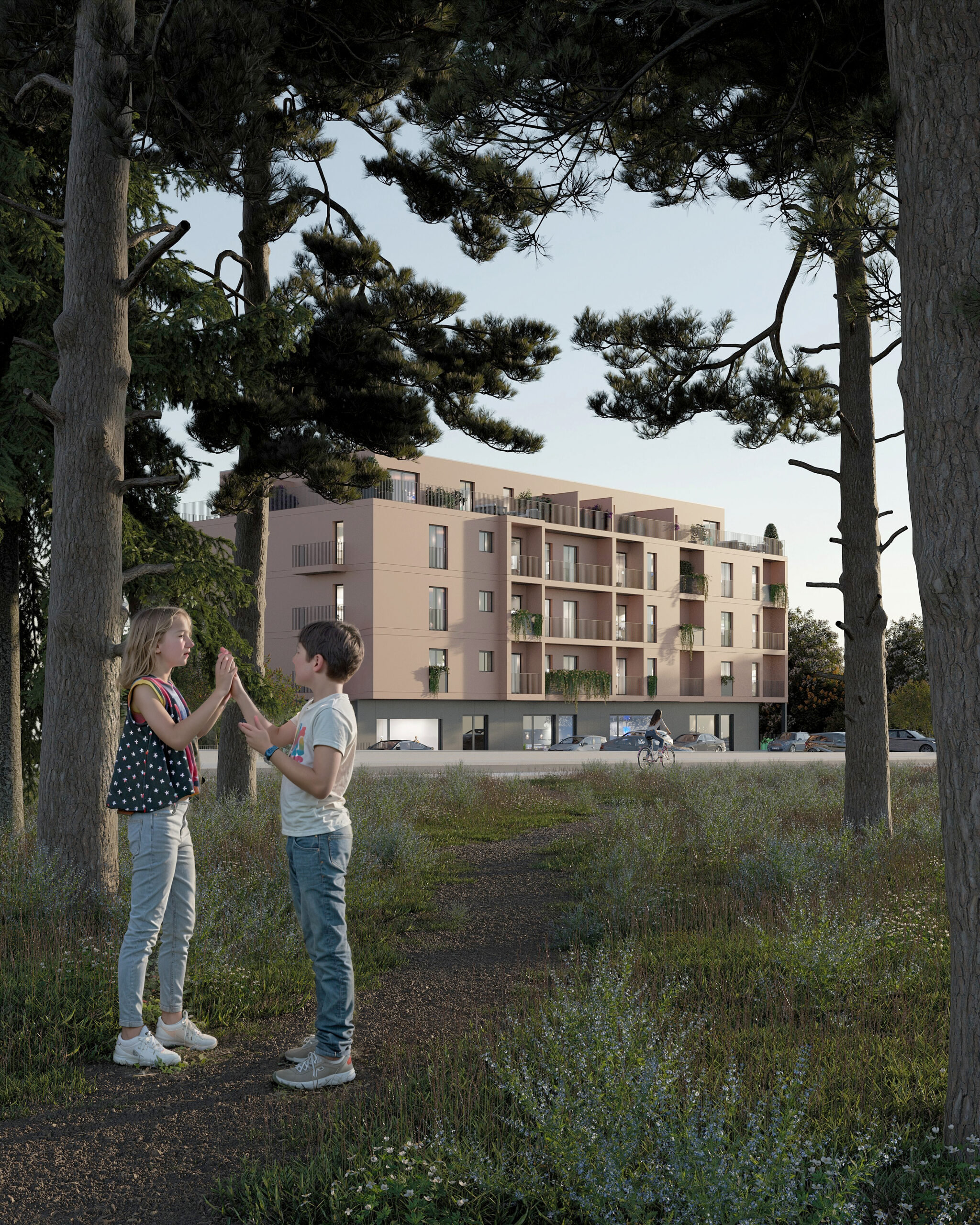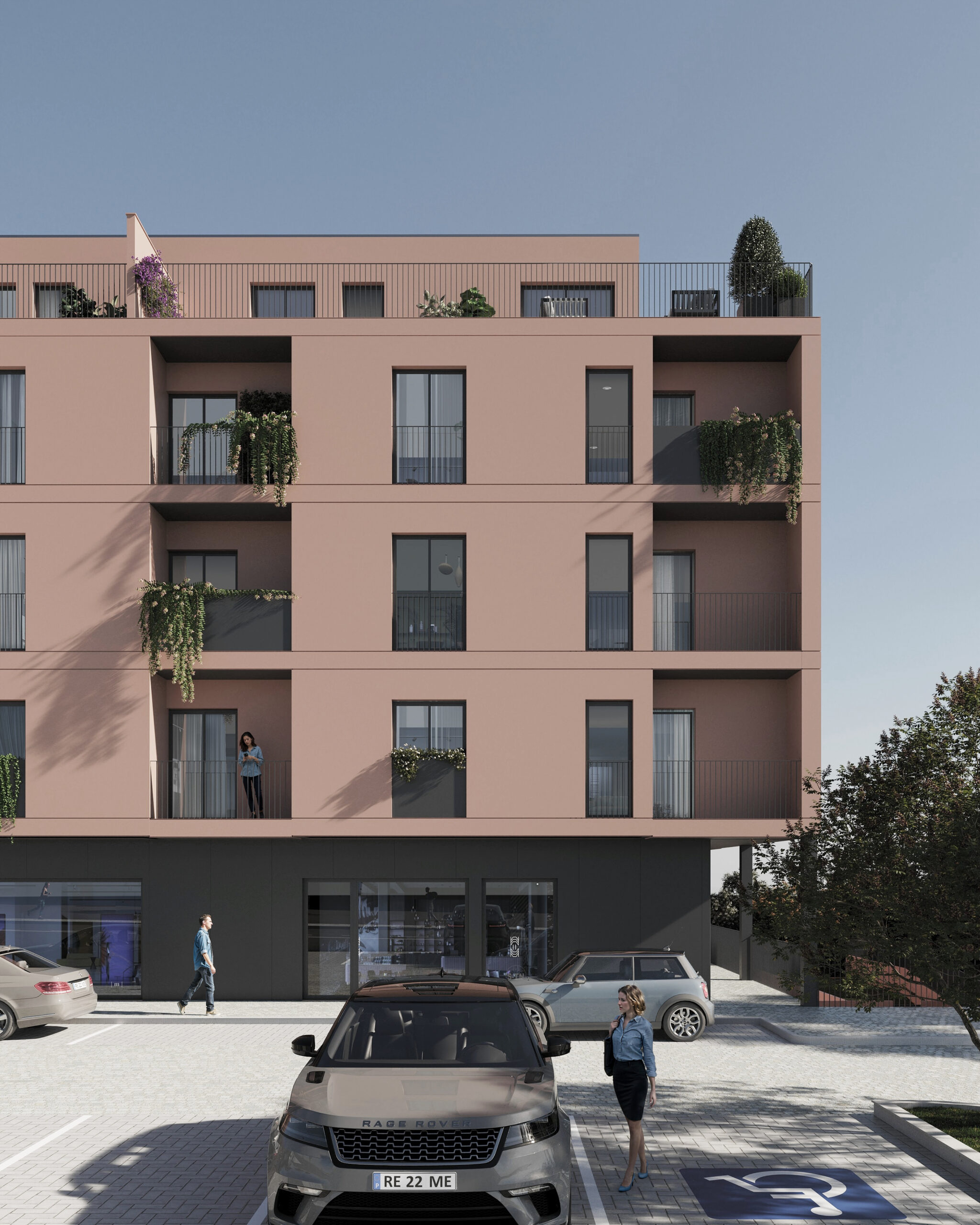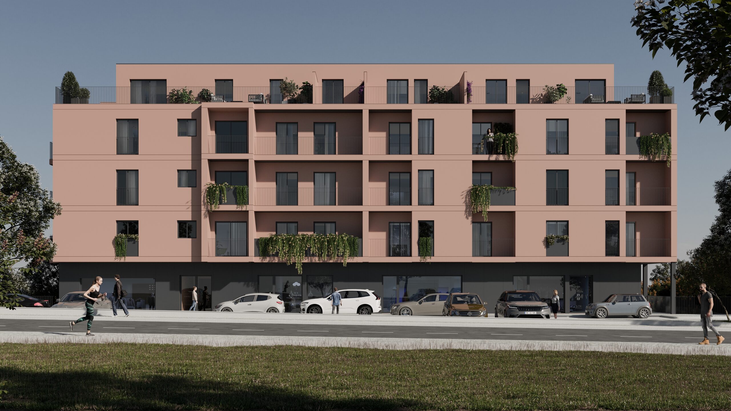 No desenvolvimento do projeto para o edifício multifamiliar em Amarante, Portugal, procurámos combinar elementos contemporâneos com a sensibilidade local, resultando numa fachada que transmite elegância e integração com o ambiente. Optámos por uma paleta de cores que inclui a tonalidade suave do salmão para a fachada, complementada pelo contraste marcante do preto nas grades, guardas e caixilharias. Um toque de verde é adicionado às varandas, onde plantas exuberantes cobrem parte das guardas, acrescentando não só um elemento estético, mas também uma ligação à natureza envolvente. Este conceito visa não apenas criar um espaço residencial funcional, mas também um ambiente que inspire e promova um estilo de vida harmonioso para os seus moradores.